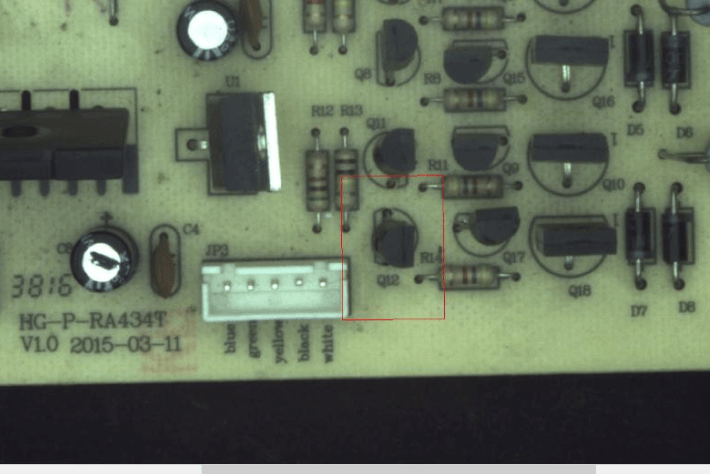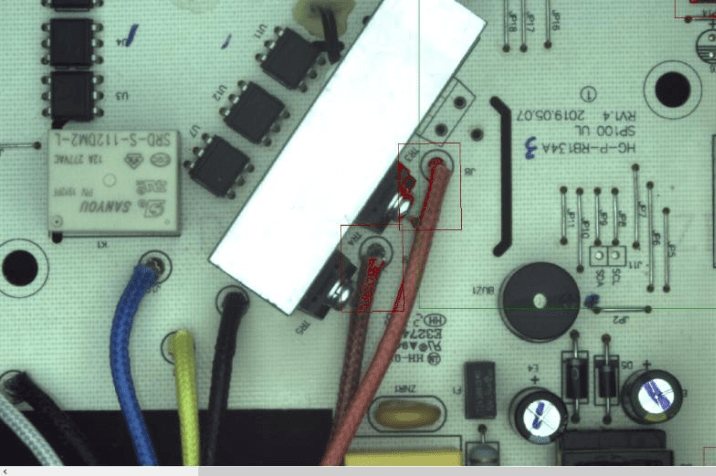檢測流程如下:產品就位后客戶設備端給出觸發信號,工業相機完成圖像采集,PCB板元器件智能視覺檢測系統對檢測內容(元器件(插件)混料檢測、元器件(插件)有無檢測、元器件(插件)正負極檢測、元器件(插件)顏色檢測、元器件(插件)方向檢測、焊線顏色檢測、端子座顏色檢測、端子座方向檢測)進行高效分析處理。并將處理后的結果,輸出OK/NG結果給到客戶指定端,整體檢測結果示意圖如下;